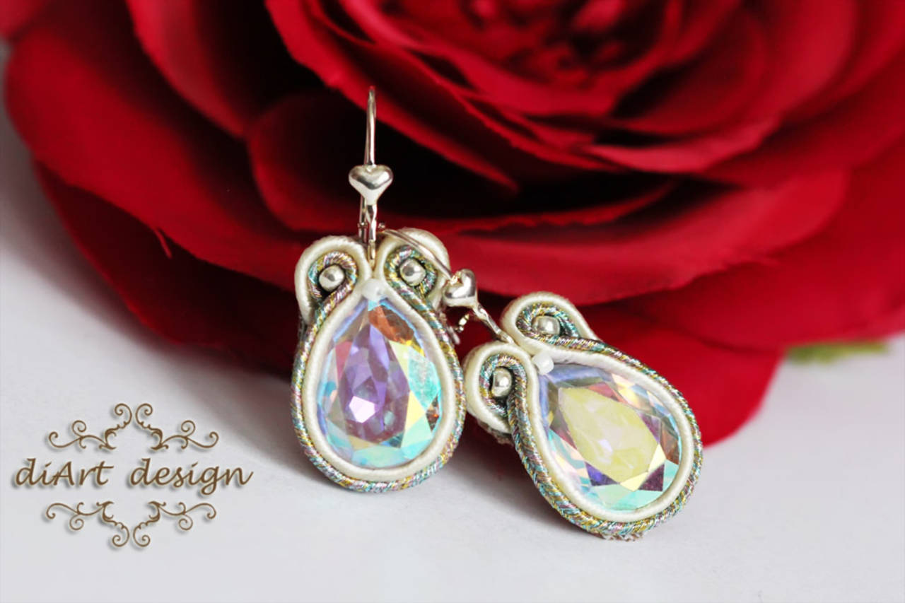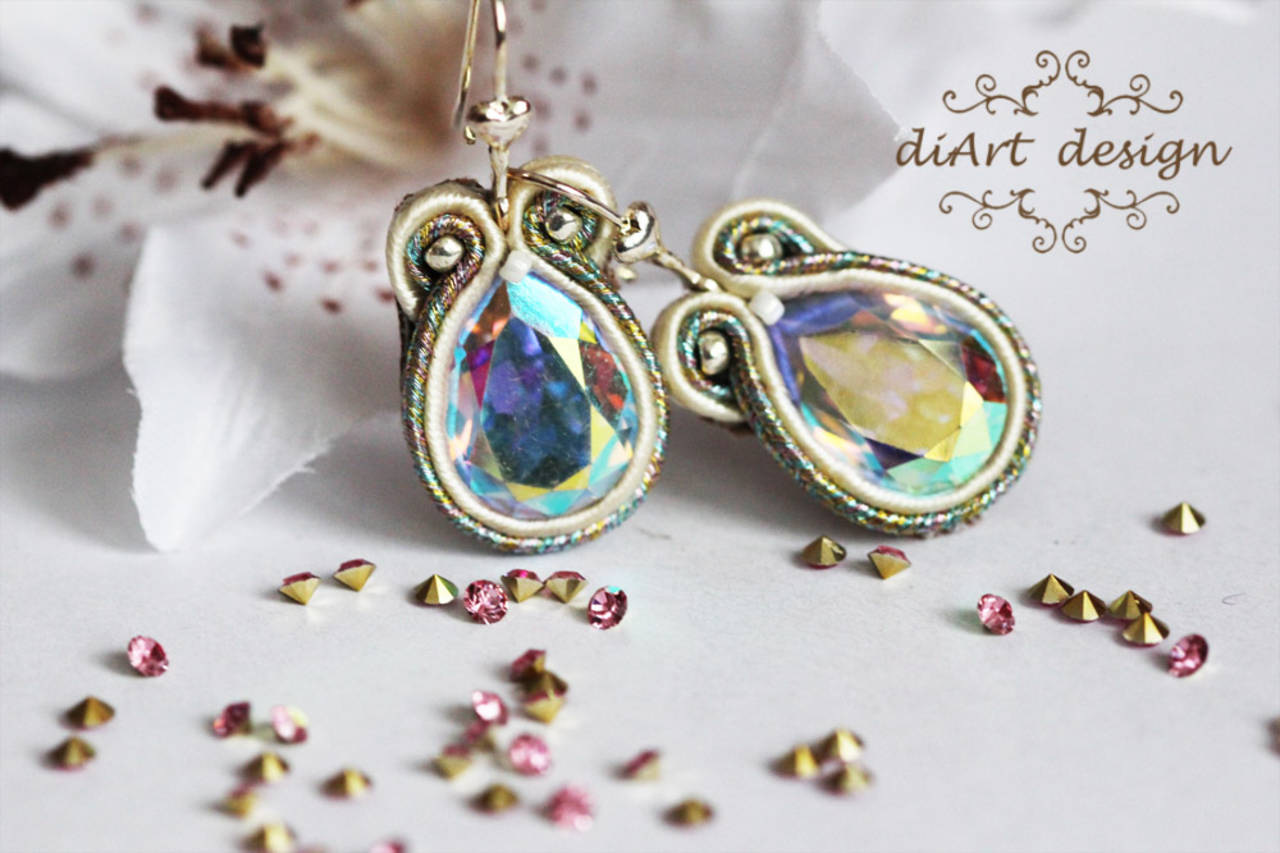 sutaškové náušnice menšie s meňavým stredovým kabošonom, obšité sutaškami vo farbe color mix a smotanovej. Náušnicové zapínanie je mechanické, v tvare kvapky.